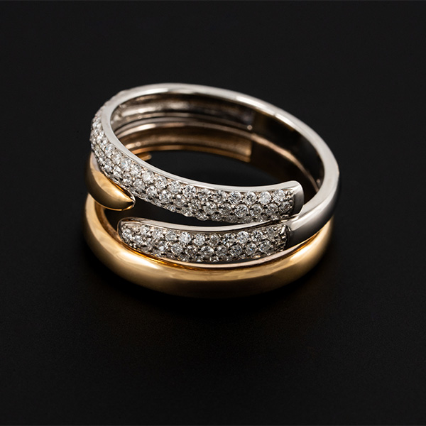Anel com duas cores de ouro onde cravamos no ouro branco 105 diamantes VVS num total de 0,52 cts