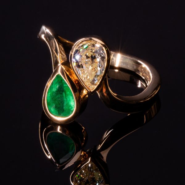 Anel em Ouro com duas pedras preciosas com lapidação em “pear shape”